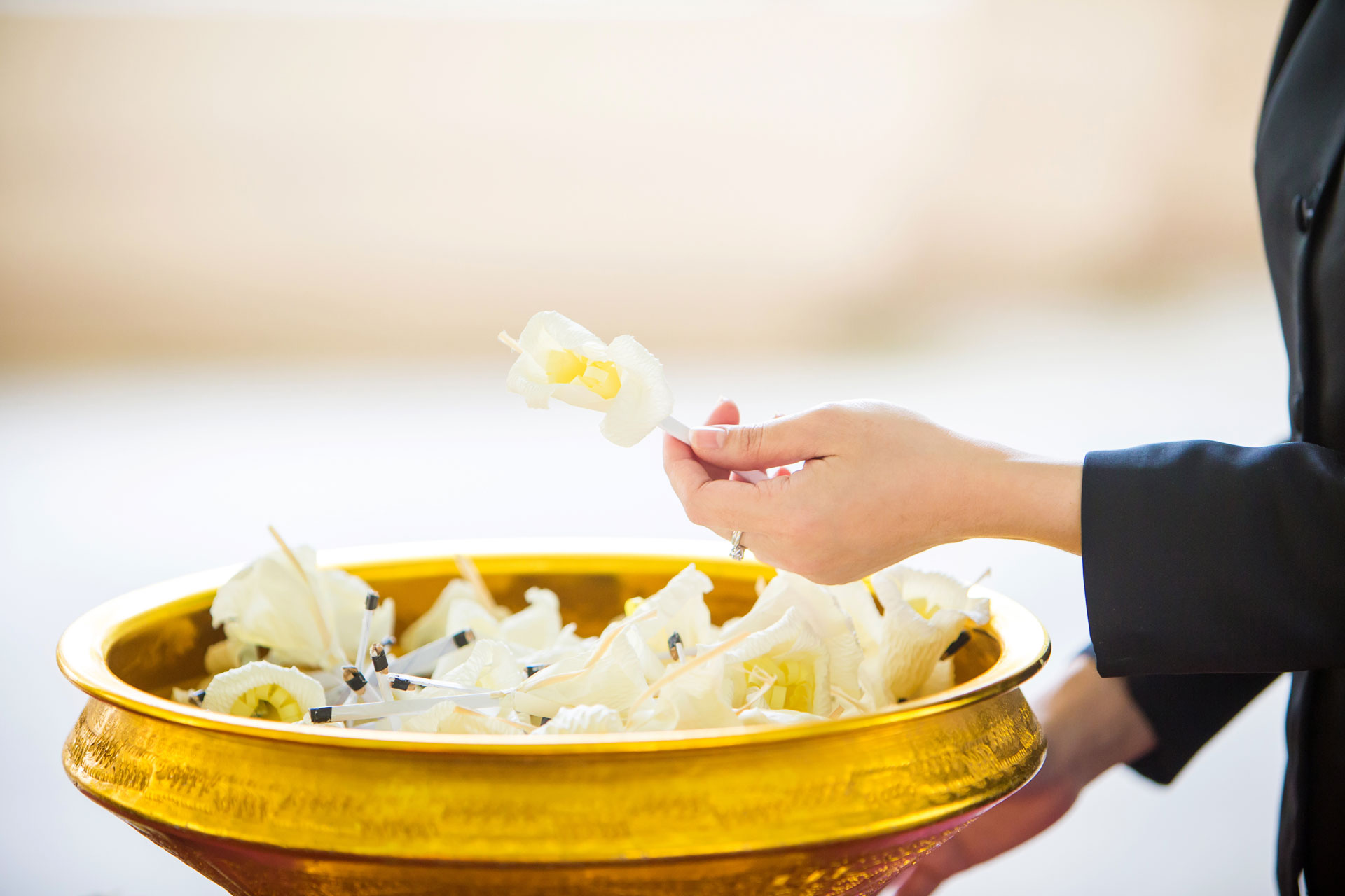 4. จากนั้นจะเป็นการร่วมวางดอกไม้จันทน์ โดยบางงานอาจกำหนดให้ผู้หญิงขึ้นทางด้านซ้าย ผู้ชายขึ้นทางด้านขวา และลงทางด้านหน้าของเมรุ (ขึ้นอยู่กับความเชื่อของแต่ละงาน) ซึ่งควรเดินเรียงแถว สองแถวเป็นระเบียบเรียบร้อย การวางดอกไม้จันทน์จะหยิบจากพานด้วยตัวเอง ไม่นิยมให้คนอื่นหยิบให้ หรือส่งต่อให้ผู้อื่น เดินถือดอกไม้จันทน์ด้วยอาการสำรวม สงบนิ่ง ไม่พูดคุยหยอกล้อกัน ยกมือไหว้เคารพศพผู้เสียชีวิต 1 ครั้ง ระหว่างนี้กล่าวภาวนาถึงมรณานุสติ หรือกล่าวคำขอขมา ต่อผู้เสียชีวิตแล้วจึงวางดอกไม้จันทน์ไว้ใต้เชิงตะกอน หรือในพื้นที่ที่เจ้าภาพจัดไว้ให้